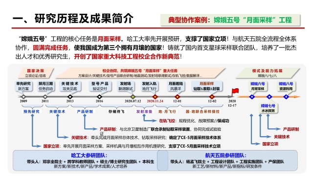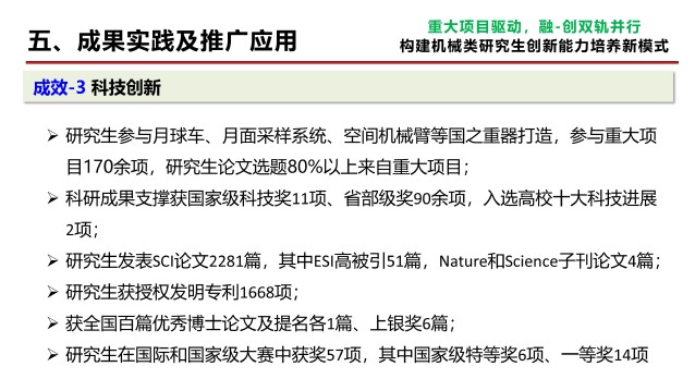1)工程能力显著提升,论文选题80%以上源于载人航天、探月工程等170余项重大项目,助力研制出月球车、火星车、月面采样装置、空间机械臂等国之重器,学生科技攻关成果支撑获国家级科技奖11项、省部级科技奖90余项。