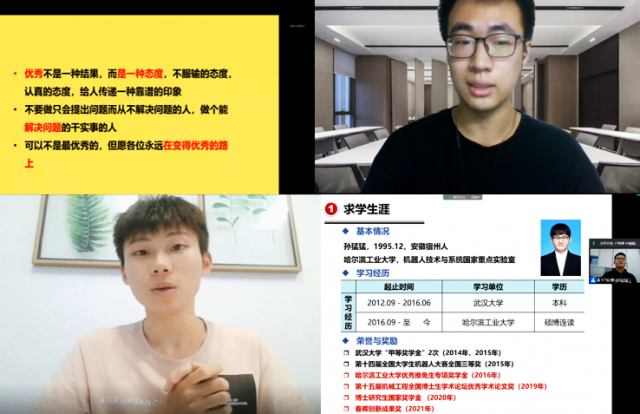 薪火相传一百年,对话优秀机电人。为全面落实习近平总书记对榜样学习的重要指示,学习习近平总书记贺信精神,传承和发扬一代代工大人精神,机电学院启动了“对话机电人”系列采访活动。7月10日,机电学院学生会邀请到了优秀博士毕业生孙猛猛以及优秀硕士毕业生林能旭接受采访,以期为同学们指点迷津,本次会议采用云采访的形式,由张紫涵主持。