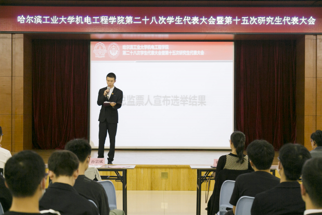 会议在庄严的国歌声中拉开了序幕。首先由第二十六届研究生会主席团成员刘海超宣读哈尔滨工业大学研究生会贺辞,传达了校研究生会对白菜社区 研代会召开的热烈祝贺。第二十七届学生会执行主席赵志豪、第十四届研究生会主席团成员汪乐洋向大会做工作报告,总结了在过去一年中取得的成果和仍需改进提高之处,并对未来的工作提出了期望。随后由学生会主席团成员王笠镔作提案工作报告,向各位学生代表汇报本次学代会、研代会的提案征集工作成果,指出了未来一年内机电学院学生会、研究生会的工作重心。接下来的大会竞选环节中,各位候选人充分展现了自己的综合素质,全方位阐述个人竞选优势,并说明了自己对学生会、研究生会的工作规划。竞选演讲结束后,参会代表对学生会、研究生会主席团进行了投票选举。