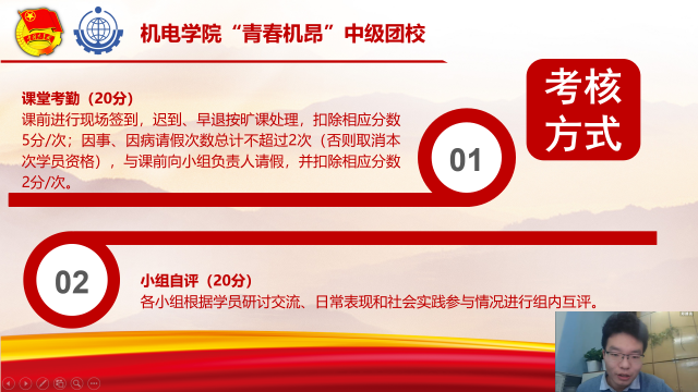 2021年11月12日晚,机电学院“青春机昂”中级团校开班式于哈工大APP会议平台成功举办。校团委书记王东升老师、机电学院党委副书记吕焱老师、机电学院团委书记孙宗斌老师及学院全体辅导员出席本次活动,开班式由机电学院团委组织部部长陈征主持。