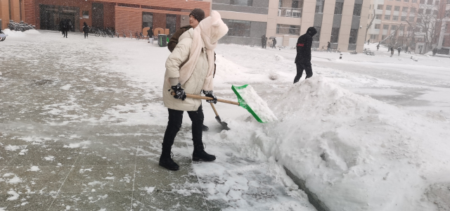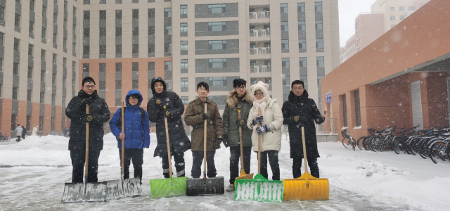 中午12:00,机电学院2020级本科生扫雪先锋队在B栋门前手持扫把、铁锹,待公寓领班阿姨划分扫雪区域后,就立马投入到扫雪中去。尽管天气严寒,气温很低而且伴随着大雪纷飞,但面对诸多困难,全体先锋队员不为困难所动,挥动着铁锹等劳动工具清扫积雪,齐心协力,配合默契,铲的铲、扫的扫,忙碌的身影构成了一道亮丽的风景线。在消除安全隐患的同时,也方便了广大师生。