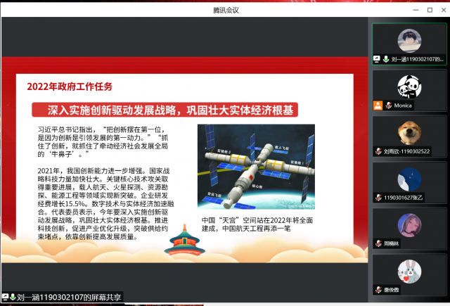 (文/宋宁宁)为深入学习2022年政府工作报告内容,丰富政治理论学习内容,白菜社区 2019级本科生第二党支部于2022年4月25日18:30在线上召开了四月组织生活。本次组织生活由第一党小组成员狄可欣同志主持,支部党员同志全员参与。