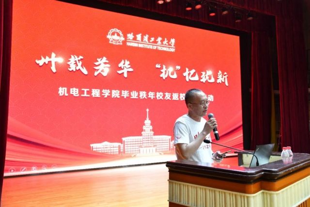 曾可凡校友作为校友代表发言,深切诉说了自己对母校的思念和重返母校的激动心情。他表示,在哈工大机电学院的求学经历是十分难忘的,也正是哈工大“规格严格,功夫到家”的校训精神有效助力了他毕业以后的工作生活。他也真切祝愿哈工大与机电学院的未来会更加美好。