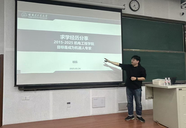 赵京东教授以《空间在轨服务机器人现状与展望》为题,为同学们介绍了机器人技术在空间在轨服务中的应用,并结合空间站机械臂等前沿案例,通过一个个生动的应用场景,为同学们勾勒出机器人技术的宏伟蓝图,激发了同学们对机器人领域研究和学习的兴趣与热情。博士生祁乐以《在机电的十年成长密码》为主题,用亲身经历串起本硕博阶段的科创经历、科研攻关、学科竞赛、创业实践等内容,并结合自己的认识给学弟学妹们提出了中肯的建议。